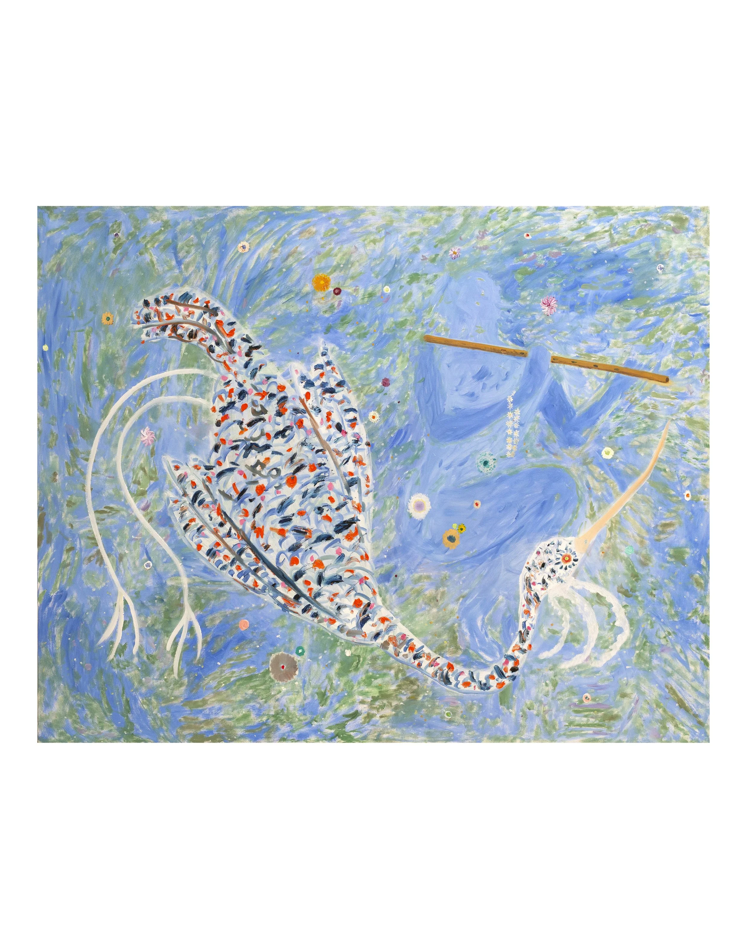 Inspired by André 3000’s 2024 album New Blue Sun, Robby’s paintings explore how sound and imagination intertwine. Figures emerge within lush, dreamlike environments, surrounded by floral motifs, egrets, and flowing patterns. Bold brushwork and layered compositions echo the improvisational nature of music, balancing spontaneity with careful intention.